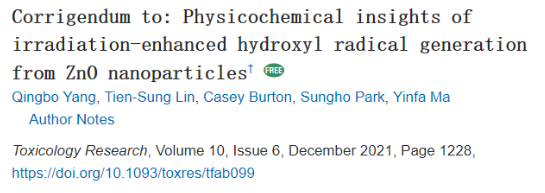 1. 更正:关于从氧化锌纳米粒子产生辐照增强的羟基自由基的物理化学见解