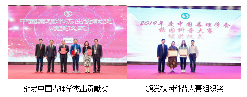 会议还期间还举行了2019年度毒理学杰出贡献奖、校园科普大赛奖、优秀论文、志愿者表彰仪式。陈春英、蒋义国、牛侨三位学者获得中国毒理学杰出贡献奖,周平坤理事长、赵宇亮院士、罗氏集团解建勋教授颁奖;表彰了2019年校园科普大赛的两个获奖单位山东大学公共卫生学院、内蒙古科技大学包头医学院以及5名优秀参赛个人;给20位优秀论文获得者颁发了证书;给大会支持单位代表颁发了纪念奖牌。
