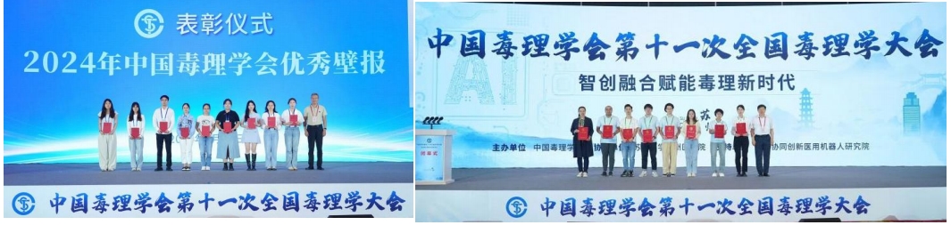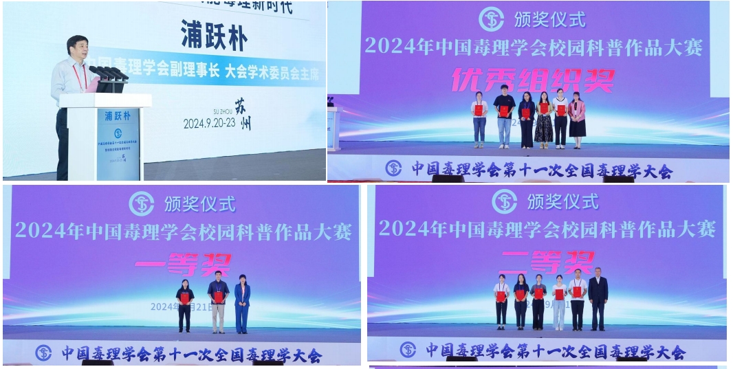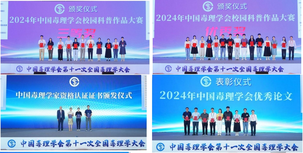 大会开幕式上还表彰了学会2024年校园科普大赛的六个获奖单位苏州大学苏州医学院公共卫生学院、海军军医大学、广州医科大学公共卫生学院、南华大学公共卫生学院、首都医科大学公共卫生学院、南京医科大学公共卫生学院以及30名优秀参赛个人。大会闭幕式上为本次大会优秀论文获得者颁发了证书,鼓励他们继续投身科研取得更多成绩;为2023年度中国毒理学家资格认证代表颁发了证书,以激励更多青年学者投身于毒理学研究事业中来;为志愿者代表颁发了证书,感谢他们为大会热心周到的服务;为科技成果展代表颁发了支持单位证书,感谢他们对大会的鼎力支持。
