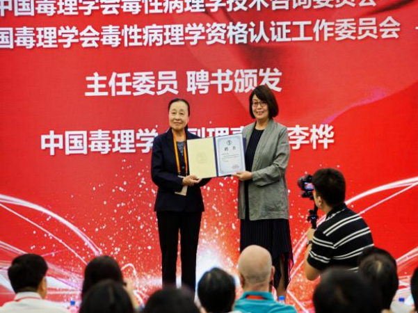 李桦副理事长(左)向毒性病理学资格认证工作委员会和技术咨询委员会胡春燕主任委员(右)颁发证书