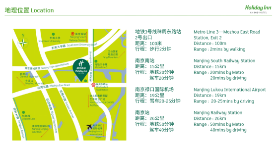 交通:酒店距离禄口国际机场约20分钟车程,距离南京南站约25分钟车程,3号线秣周东路地铁口步行约5分钟。