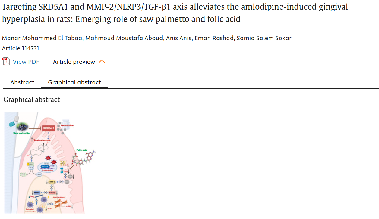 概述:氨氯地平可诱导大鼠牙龈增生,锯棕榈和叶酸可分别通过阻断(SRD5A1)活性和抗炎抗氧化发挥其抗增殖作用,从而缓解氨氯地平诱导的牙龈增生。