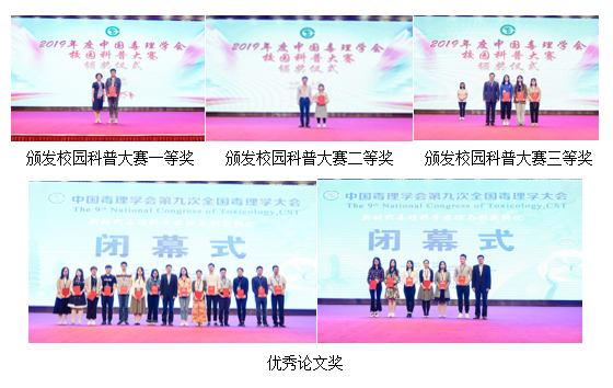 会议还期间还举行了2019年度毒理学杰出贡献奖、校园科普大赛奖、优秀论文、志愿者表彰仪式。陈春英、蒋义国、牛侨三位学者获得中国毒理学杰出贡献奖,周平坤理事长、赵宇亮院士、罗氏集团解建勋教授颁奖;表彰了2019年校园科普大赛的两个获奖单位山东大学公共卫生学院、内蒙古科技大学包头医学院以及5名优秀参赛个人;给20位优秀论文获得者颁发了证书;给大会支持单位代表颁发了纪念奖牌。