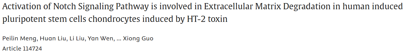 概述:使用人诱导性多能干细胞软骨细胞构建体外模型,发现HT-2 毒素可通过激活 Notch 信号传导诱导 hiPSCs-软骨细胞的 ECM 降解,这可能是HT-2 毒素诱导地方性软骨病的作用机制。