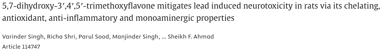 概述:使用醋酸铅对大鼠进行暴露构建脑损伤模型,发现5,7 -二羟基- 3′,4′,5′-三甲氧基黄酮(TMF)可通过其螯合、抗氧化、抗炎和单胺能特性缓解金属诱导的脑损伤。