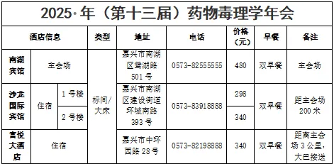 特别提醒:为便于参会期间的活动安排,建议优先选择南湖宾馆和沙龙国际宾馆。如有特殊需求选择嘉兴富悦大酒店,也无需担心会议期间的通勤问题,会务组的班车服务将为您保驾护航!